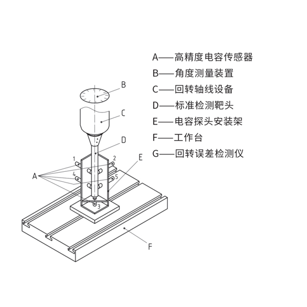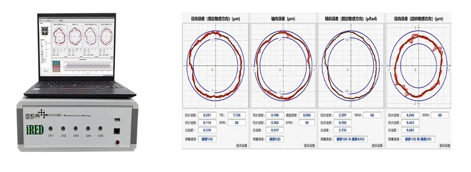 iRED回转误差检测仪,依据ISO230-7标准评估回转轴在五个自由度上的误差运动。在回转轴的末端,安装高精度标准靶头,使其随回转轴旋转;在靶头周围安装高精度电容位移传感器,测量回转轴转动时对应的位移量。