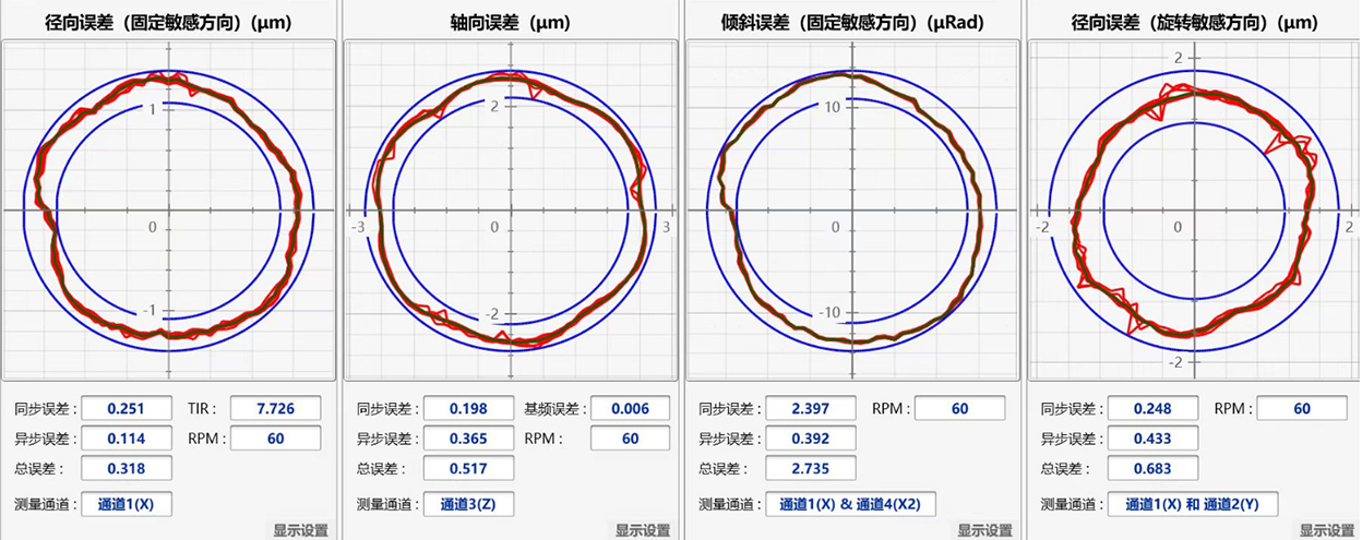 X与Y方向的径向误差可由两个相互垂直的位移传感器测得;轴向误差可由沿Z向安装的传感器测得;绕X与Y轴的偏摆误差则可由不同轴位置处的两组径向误差计算得到。再通过专用软件处理,图形化显示测量结果,保存测量数据。