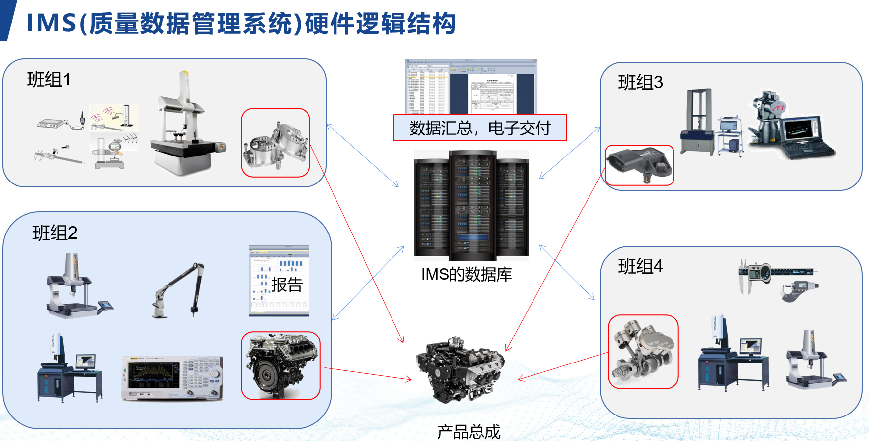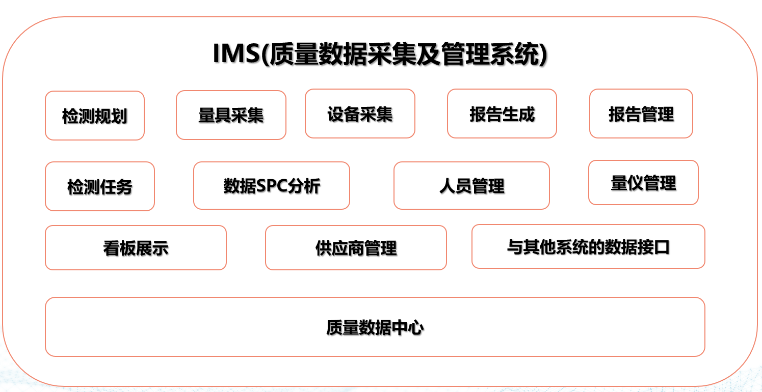 IMS质量数据采集及管理系统,可通过有线/无线的形式将各类量具量仪、检测设备联网,实现检测数据的自动采集(iOT),并将采集的数据存储为结构化的数据。实现电子检测报告的自动生成和报告的审批管理。同时,系统可实现数据的存档、追溯查询、生产过程质量分析(SPC分析)、质量监控、产量统计、合格率统计等功能。