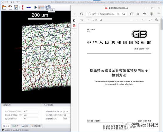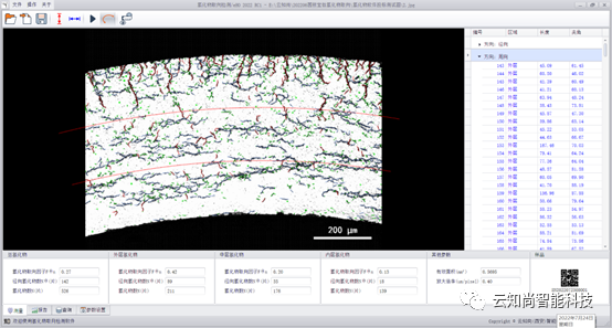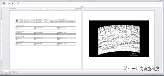 云知尚eHO软件,为核工业中这一关键的检测任务开发设计。检测软件配备图像显示界面,将金相显微镜拍摄图片导入检测软件,并可实现读取图片的编号、样品编号、显微设备名称、扫码功能。软件界面可针对图片进行操作,可执行放大、缩小、拖动功能。软件独特的图像处理算法,实现图像预处理(包含图像降噪、图像有效区域识别)、内外径识别、小圆弧拟合、标尺识别、氢化物面积和样品有效面积识别、外中内分区、自动识别氢化物线条、自动识别氢化物长度和角度、自动分类氢化物、显示分类结果、氢化物数据统计、自动计算氢化物取向因子。