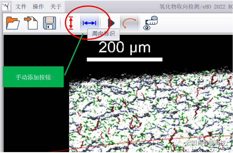 在原图上标识无效氢化物线条、径向氢化物线条、周向氢化物线条。其中以绿色标识长度未达设定标准的无效氢化物线条,以红色标识径向氢化物线条,蓝色标识周向氢化物线条。