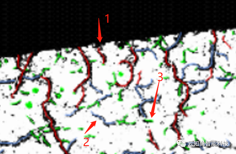 上色效果图如下,1号氢化物为径向氢化物,被标识为红色;2号氢化物为周向氢化物,被标识为蓝色;3号氢化物长度未超过给定值,被标识为绿色,不计入氢化物取向因子计算。