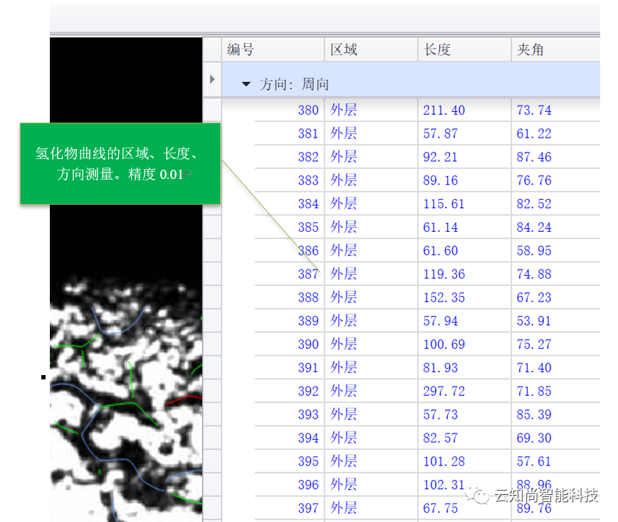 计算提取出的氢化物线条长度,根据GB/T 38913-2020标准,进行长度判断并分割,分叉判断并分割。当线条长度小于设定阈值时,判定为无效氢化物线条并记录;当线条长度高于设定阈值时,判定为有效氢化物线条并记录。对分割后的氢化物线条像素坐标使用最小二乘法进行直线拟合以确定氢化物线条角度。氢化物长度精确到0.01微米,与径向夹角精确到0.01°。