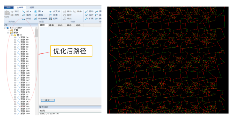 针对用户的高速激光打孔的要求,云知尚设计了一套专业的圆孔切入及切出算法,软件根据用户的dxf图纸,自动计算切入及切出方式,自动计算各个孔之间的跳转方式以及运动速度,加速度。移除重复形状,组合连接形状。同时进行网格优化,大幅提高振镜的执行效率。经现场反复测试,使用相同的打孔设备硬件,采用ePath-Laser软件后,60000个孔的加工时间可控制在20分钟。