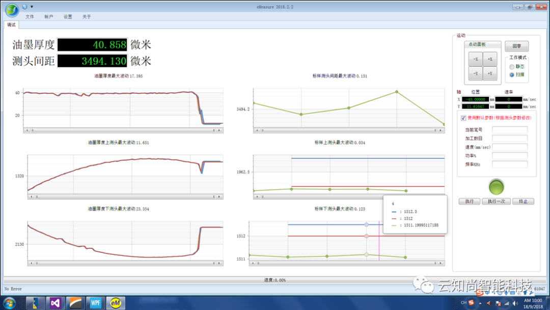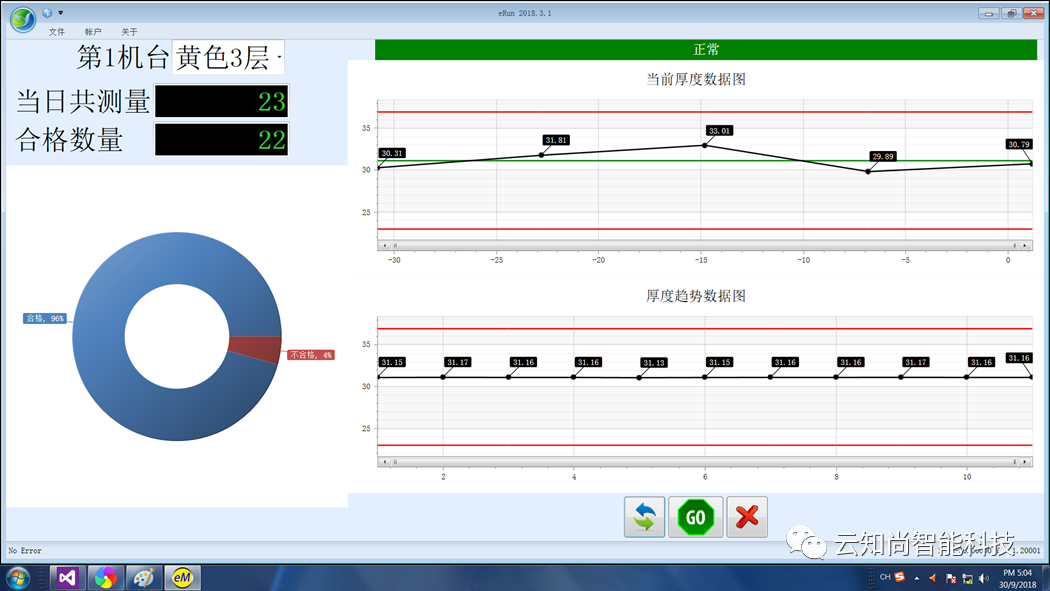 根据用户的使用场景和需求,云知尚iCoating为用户深度定制了测量系统软件。软件可以实时显示当前的厚度测量值,厚度测量值变化趋势图。根据测量趋势,实时与印刷设备通信,调整油墨比例以达到最优效果。软件同时可将测量结果送入用户的MES系统,方便工厂自动化统筹管理。