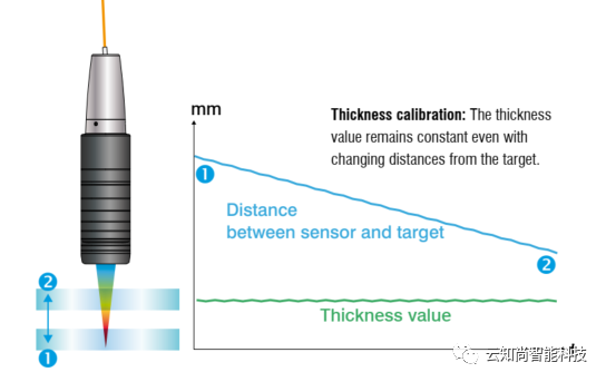 云知尚iCoating采用德国Micro-Epsilon的光谱共焦传感器,其分辨率可达4nm,测量光斑直径仅有6um,同时,适应的安装倾角可达±34°。系统采用两只光谱共聚焦测量头,利用光谱共焦测头光线可以穿过玻璃的特性,其中一只测头直接测量油墨表面,另外一只测头穿过玻璃,测量油墨的下表面,这样就能直接的测得油墨涂层的厚度。