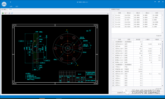 云知尚DMIS-Support中的eQV-DMIS模块,可以自动识别设计图纸中的要素,进行特征解析。再将解析结果导入到PC-DMIS测量软件中。用户编写测量程序时,只需要建立好坐标系,设置好测头测座,接下来的编写各个尺寸检测程序的工作,就可以交给eQV-DMIS来完成。