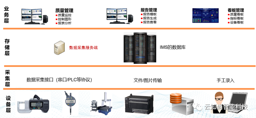 IMS系统采用四层架构,底层为设备层,包括各类检测设备,三坐标、影像仪、粗糙度仪、卡尺、千分尺等;采集层通过不同的采集方式,实现设备的数据采集,支持文件自动数据采集、检具量具自动数据采集、手动录入数据采集、数据库接口数据采集等;所有采集的数据存入IMS数据库,实时提供给业务层进行数据展示,包括质量管理、报告管理和看板管理。