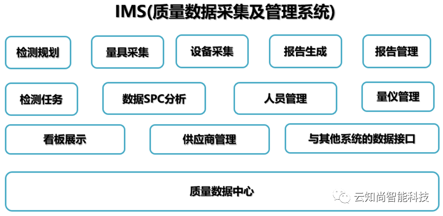 云知尚IMS质量数据采集及管理系统的基础功能模块分为4大类:系统管理、作业规划、数据采集、报告分析。
