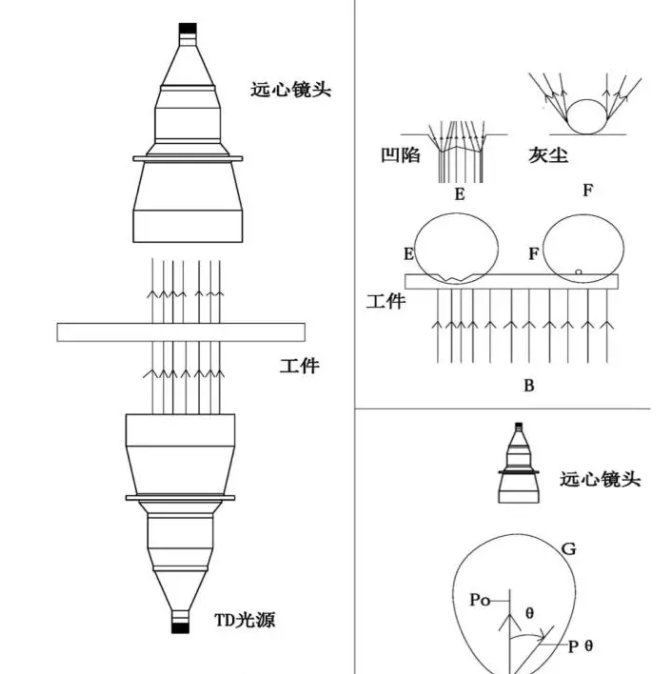 灿锐光学推出针对平面透明工件灰尘和划痕专用检测光学模块,如图 2(A)所示。当工件上没有缺陷时,TD光源的出射光线到达工件发生透射,透射光线进入远心镜头,如图 2(A)所示。当工件上有凹陷和灰尘时,TD光源光线发生折射和衍射,如图 2(B)所示。发生折射和衍射光线的能量P(θ)= Poexp[(-0.5)( θ/σ)2] 其中Po:镜面透射的光线的能量,P(θ):与镜面透射光线夹角θ光线的能量,σ:标准差的高斯分布,在散射光的大部分能量都集中在一个沿镜面透射方向的圆G内如图 2(C)。TD光源光线遇到工件凹陷和灰尘发生折射和衍射后,进入远心镜头的光线也都在镜面透射方向的圆G内,镜头接受到折射和衍射后光线的能量比传统检测模块强很多,解决了传统检测需要配强光灯和人为旋转光源角度的问题。