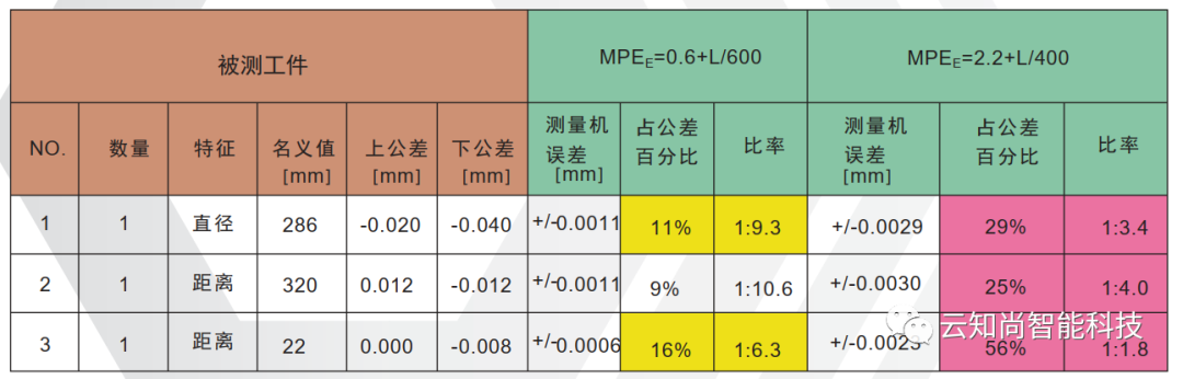 另外一个方法是,所有被测特征(距离、直径、形状和真实位置),连同其公差要求,都在一个表中列出。然后列出根据 ISO 10360 国际标准规定的测量机 MPEE 值、MPEP 值和 MPETHP 值,这样,就可以计算出相应的“公差与测量精度”比例参数。例如:在给定距离和直径情况下计算需要的MPEE 值,(请参见图 9.2),测量机与被测零件的精度的比例,视具体情况而定,一般在 1:3 到1:10 之间。