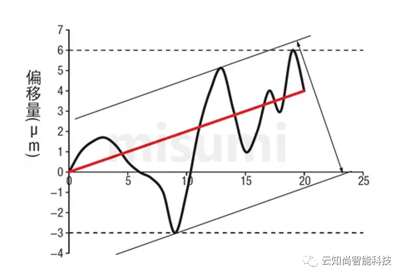 由于导轨系统的不完善,运动轴的实际运动轨迹可能偏离直线。这一误差称为直线度运动误差。它包含与运动方向正交的另外两个方向上的偏移。直线误差不同于导轨的直线度误差。它是由导轨系统综合作用而产生的。沿着不同的直线测量时,测得的直线度运动误差是不同的。 通常,直线度运动误差与定位误差沿同一条直线测量。