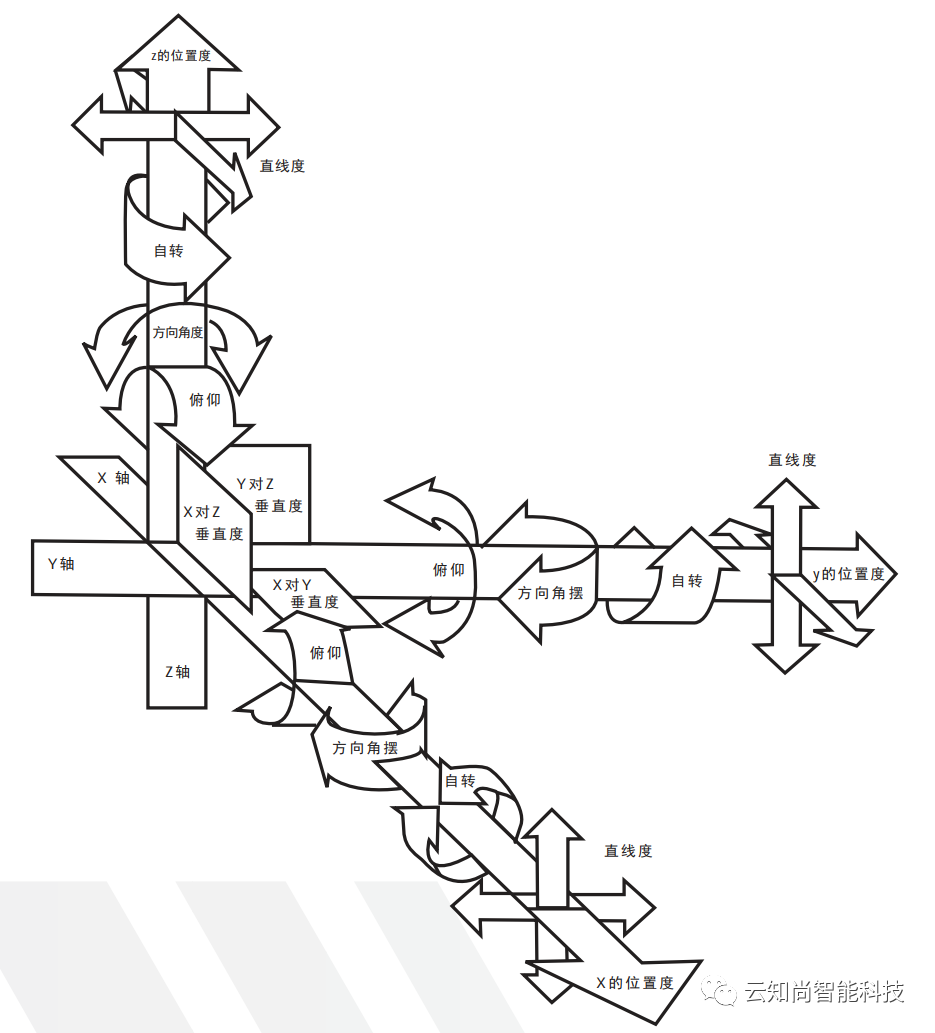 三坐标测量机的每个运动轴有1个定位误差,2个直线度运动误差,3个角运动误差,共6个运动误差,它与一个刚体的6个自由度相对应。三坐标测量机有沿着X,Y,Z方向的三个轴,实现了三维测量,由此也带来了18项运动误差;再加上我们上一篇介绍的三根轴之间的垂直度误差,总共有21项误差。这就是我们常说的21项几何误差,也称为21项机构误差。